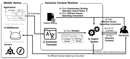 It is necessary to analyze context-related information used in service and sensing-related information to infer the context, in order to eliminate unnecessary power dissipation in exclusive contexts. As previously mentioned, various modeling methods exist to define context and sensing-related information. Most of the methods require very detailed and versatile information for operations including interoperability, scalability, and self-adaptability, and this places a burden on developers. In this study, the system only takes automata (sensing behavior model, c) as an input to avoid this burden. However, it is not possible for the expert system to directly read automata, and therefore it is necessary to convert the automata to a form that can be used in an expert system. The Automata translator translates the automata into a context-sensing model (f). The ExCore inputs this context-sensing model to the expert system as facts, and the expert system deduces the unnecessary sensing operations related to the exclusive contexts.