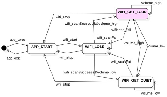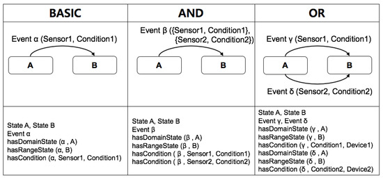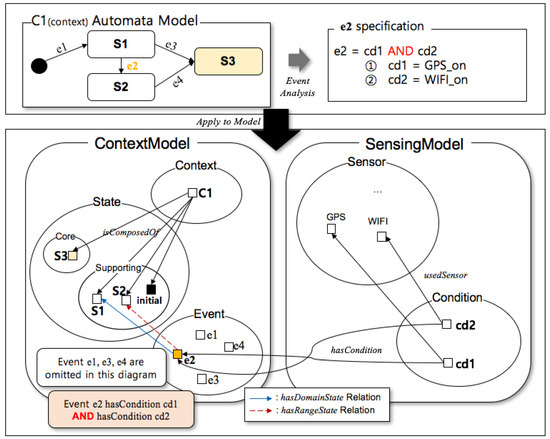 Figure 5 illustrates a context-sensing model with the goal of expressing the values of the sensing behavior model in the expert system. The context-sensing model consists of a context-model that contains abstract information related to the context and a sensing model that is responsible for explicit information related to the actual sensing data. Additionally, they are composed of entity-related information and relation-related information and are designed to be easy to interpret by the expert system. In detail, the context of a context-sensing model is composed of states, and the states are divided into marked states deducing the core context and supporting states deducing the support contexts. Each state is transited by the event of the sensors and has a domain state that corresponds to the start of transition and a range state that corresponds to the arrival of the transition. The event occurs when one or more sensors (GPS, Wi-Fi, etc.) satisfy the condition.
