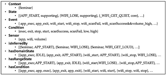 Figure 2, the studying context and the seminar context do not occur simultaneously irrespective of the accuracy of the context inference algorithm. This is because sensing data that supports the exclusive contexts are disjointed at the primary context level. When no Wi-Fi signal is received, both contexts are not inferred. When a Wi-Fi signal is received, only one of the two contexts will be inferred according to the condition based on the pre-defined volume threshold. It is not possible for the data (events) collected by a sensor to have more than two values simultaneously, and therefore the contexts cannot be simultaneously inferred if the types of sensors used to infer exclusive contexts and their values are disjointed. On the other hand, in the case that the sensors or their values are not disjointed, exclusive contexts could be inferred. In the example shown in