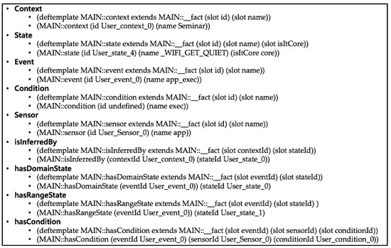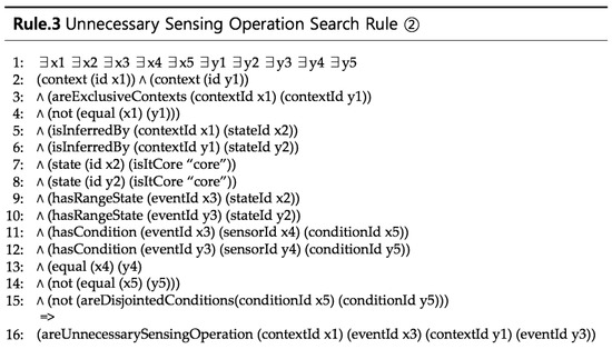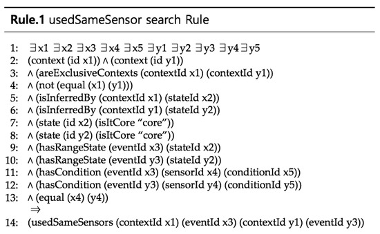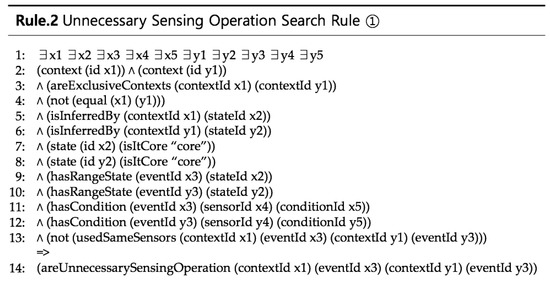 Figure 10. It checks whether there exists a fact satisfying the conditions (2–13) among the facts in the expert system by the existential quantifier (1). If there is an unnecessary sensing operation, the fact (14) is added in the expert system. To examine this rule closely, it checks whether there are two different contexts (2, 4) which are the exclusive contexts (3) in the expert system. Then, it identifies the core state (7, 8) among the states inferring them (5, 6). After that, it checks the sensors and the conditions of the event (11, 12) that makes the transition (9, 10) to the core states. Finally, it checks whether there is the fact, the usedSameSensors (13), in the expert system.