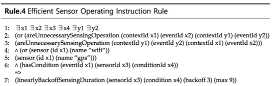 First of all, for identifying the unnecessary sensing operation, we should check whether there are any sensors of the same type used for the exclusive contexts. Rule 1 is responsible for this as shown in