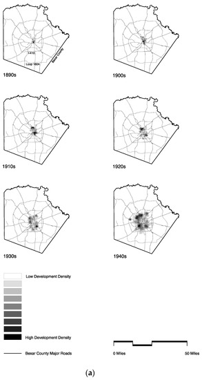 (a) Kernel Density Analysis for Construction, Bexar County 1890s–1940s; (b) Kernel Density Analysis for Construction, Bexar County 1950s–2000s. Note: The current location of arterial and ring roads is included on all diagrams for geographic reference only.