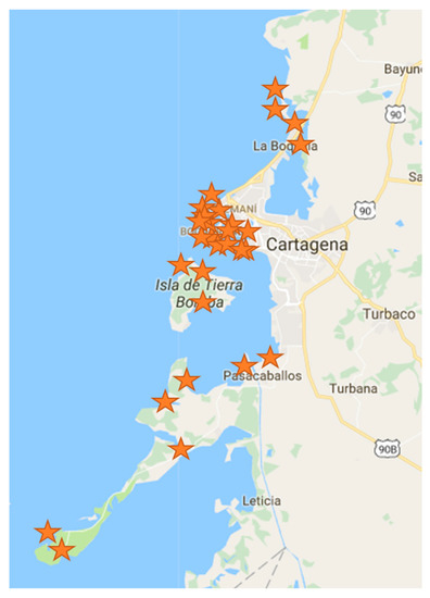 Cartagena de Indias is one of Colombia’s main cities located on the country’s northern coast. It is favored by its good morphologic and location conditions, thanks to its proximity to the Panama Canal. The city is recognized by its natural attractions and its historical heritage, which has benefited the development of its nautical and naval industry. Thus, Cartagena de Indias represents the epicenter of the activity in the Colombian Caribbean with the highest offer of nautical facilities and related services [15,16,17].