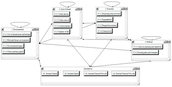 The ANP procedure, a method developed by Saaty [40] to generalize his original AHP, provides a framework to address decision making or problem assessment. It allows for more complex, interdependent and feedback relationships between the elements of a hierarchy [41], thus avoiding the compensation problem of other models [42]. It constitutes a problem in a structure or network system composed of different elements (criteria and alternatives), grouped in clusters and connected to each other in any possible way. The network provides a more accurate modeling of complex environments and allows for handling the usual situation of interdependence between elements in sustainable planning scenarios [43,44,45]. In this work, interdependence among the different criteria of the evaluation model has been determined in collaboration with the experts (Table 2).