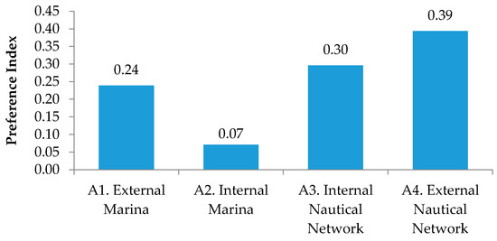 These results are coherent with the weights assigned to the criteria. The proposal A4. Design of a network of marinas, docks and nautical bases in the insular districts of the city has been positively valued due to the importance assigned to the criterion related to urban density. Thanks to this external location and the construction of different nautical and naval facilities in several zones, the future expansion of these activities could be enabled, avoiding the concentration of nautical and naval activities in a single geographical area. The fact that this alternative must also consider the importance of land-use planning in the insular zone is relevant. This factor must be strongly labored by the city, and it is reflected in the importance of the criterion related to compatibility with land-use planning and regulations.