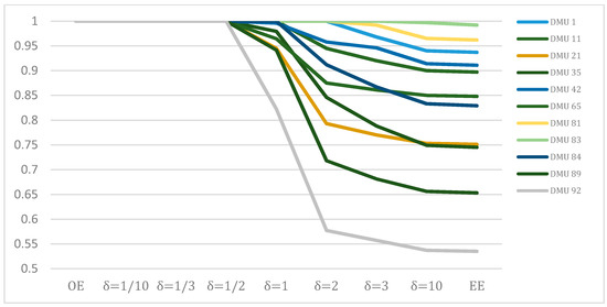 As shown in Figure 2, 11 DMUs (DMU 1, 11, 21, 35, 42, 65, 81, 83, 84, 89, 92) are operationally efficient but environmentally inefficient. Under Model (6) with δ = 1, all these DMUs are eco-efficient. However, the proposed method cannot carry out such a result because the environmental stringency is not identified. Therefore, in order to simluate the proposed method, we tried to derive the eco-effiency by changing the degree of environmental stringency. Figure 2 presents the changes of efficiency scores of 11 operationally efficient DMUs by changing δ from 1/10 to 10. From the results, we conclude that these 11 DMUs are eco-efficient when the operational concern is at least two times more important than the environmental concern. However, eco-efficiency scores are decreased as δ increases. In other words, eco-efficient DMUs in certain environments may not be eco-inefficient in other environments.