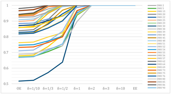 Figure 3 illustrates the efficiency changes of 29 DMUs, which are environmentally efficient but operationally inefficient. These 29 DMUs are regarded as being eco-efficient under Model (6) with δ = 1. However, the proposed model recognizes eco-efficient DMUs according to the environmental stringencty parameter. The simulation results show that all 29 DMUs are eco-efficient only when δ ≥ 2. The changes of the eco-efficiency of 29 DMUs are presented in Figure 3.
