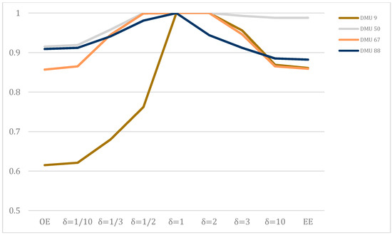 Additionally, the eco-efficiency scores of some DMUs are not skewed towards either operations-oriented situations or environment-oriented situations. For example, DMU 9, 50, 67, and 88 are eco-efficient on the condition that equal importance is given to operational and environmental concerns. However, we should note that the scores of operational efficiency and/or environmental efficiency are not equal to 1. This result explains that some DMUs can be evaluated as being eco-efficient under a certain condition, even if they are not operationally efficient or environmentally efficient.