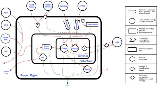 In this context, the present work sought to quantify the environmental support required for dwellers’ daily activities in five housing units on the island of Montreal, Canada (45°30′N, 73°30′W). In 2015, the Island had a total population of two million inhabitants distributed in an area of 500 km2 []. The economy of the Island is based on industrial, technology and knowledge related activities []. Net residential density (total number of dwellings divided by lot area without roads and public and institutional related infrastructure) averages 38.5 dwellings per hectare (dw/ha) on the island, ranging from around 120 dw/ha in downtown districts to 15 dw/ha in suburban residential areas []. The general objective of the study was to evaluate the ‘free’ environmental work supporting dwelling operational stage using five typical present-day housing units in Montreal Island as a case study by means of the appraisal of the main flows interacting in the residential units with the help of the emergy environmental accounting methodology to examine the usefulness of emergy-based indicators for assisting urban planning decisions, especially, in the setting-up of future residential units’ environmental design guidelines to support neighborhood planning processes.