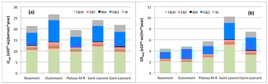As mentioned above (Table 5), the highest percentage of emergy from generated wastes corresponded to the unit in Plateau M-R; the highest per resident emergy from wastes corresponded to the unit in Saint-Leonard (3190 × 1012 seJ/person·year) and the highest per floor area value corresponded to that in Saint-Laurent (113 × 1012 seJ/m2·year), while the lowest per capita amount corresponded to the unit in Saint-Laurent (2654 × 1012 seJ/person·year) and the lowest per square meter of habitable area value corresponded to that in Outremont (47 × 1012 seJ/m2·year).
