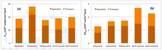 Emergy from energy for the mobility of dwellers is more affected by distance to the city center than other variables like density (Figure 3), in a like manner to other works, which have found that distance to the core of the inner city is more relevant than parameters like housing typology, density and spatial arrangement of roads []. The units in Saint-Laurent and Saint-Leonard exhibited the highest values both on a per capita basis and per square meter of built-up area; both are the most distant to the city center (Table 3) and have the highest car use split, 66.5% and 65.7% respectively []. The relatively high and low consumption of the units in Rosemont and Plateau M-R may also be explained by the combination of distance to downtown and automobile mode split (48.1% and 33%, respectively).