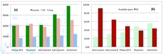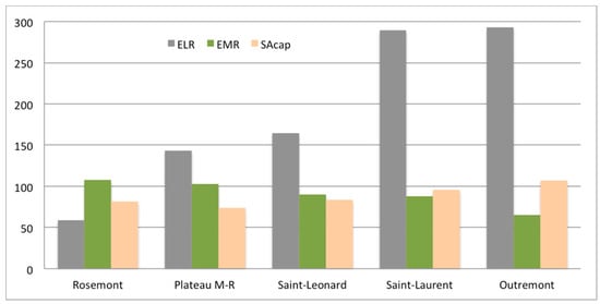 With respect to these indicators, given that for each one of them lower values correspond to better performances, in addition to their individual values (displayed in Figure 5), the simultaneous performance of the three indicators can be appreciated by taking into account the combined surface of the three bars of each housing unit. Rosemont presented the lowest ELR, which may be explained by the contribution of renewable resources coming from green areas and by the habitable area to lot area ratio (the lowest). Outremont showed the lowest EMR, where the high-income level translates into a high emergy utilization rate. The relatively low per capita and per household emergy use in Plateau M-R is reflected in a smaller need of per dweller support area. The best-combined performance corresponded to the housing unit in Rosemont.