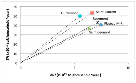As mentioned above, per household empower may inform on living quality in housing areas. For its part, emergy from the wastes generated in the housing units (here, municipal solid wastes and wastewater) divided by the total number of households in each unit is an indicator of their environmental load. High values of EH correspond to higher availability of resources, whereas high values of WH indicate greater impacts. In Figure 6, EH to WH ratios obtained for the residential units are plotted; these ratios may assist for assigning a sustainability ranking: in the graphic, a higher slope indicates a larger proportion of acquired commodities and services to generated pollutants []. In the studied units, the ranking, in descending order, was: Outremont, Saint-Laurent, Rosemont, Saint-Leonard and Plateau Mont-Royal. Higher household incomes in Outremont and Saint-Laurent units, which give them a greater ability to acquire emergy, do not seem to translate into a markedly greater amount of per household emergy from wastes.