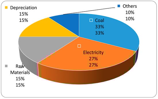 In addition, the cement industry is an energy-intensive industry. Due to the large proportion of coal and electricity cost in the process of cement production (Figure 1) [], energy price changes have a large impact on the cost of cement. Moreover, the giant energy consumption of the cement industry has brought a series of problems, which make the cement industry one of the key areas of energy saving and emission reduction. The total cost of cement includes the cost of raw materials, the cost of coal, the cost of electricity, depreciation and other costs. Big cement enterprises in most cases have their own mines, the cost of raw materials has changed little and depreciation and wages are relatively fixed, thus the cost of cement is mainly influenced by the price of coal and electricity. Even by the new dry process for cement production, the cost of coal and electricity accounts for about 60% of the production cost of cement clinker.