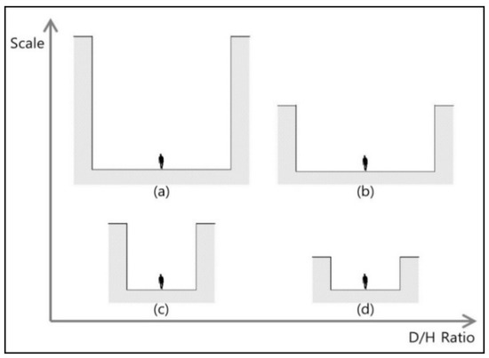 Architects and urban designers have long used the D/H ratio as a representative measure of an enclosure of an urban space such as a square or a street. For examples, Alberti suggested a D/H ratio of three to one for a proper enclosure of an urban square [16]. Lynch suggested a D/H ratio of two to one or three to one for a comfortable external enclosure [15] (p. 158). Jakle argued that when “the distance/height ratio falls below 1, space grows increasingly intimate, until eventually it is simply cramped. When distance/height equals 1, a balance is achieved, although ratios of 1, 2, or 3 are, according to Ashihara, more satisfying [17] (p. 48).” Some other researchers examined the relationship between the D/H ratios and people’s preference or perception of urban squares in quantitative ways [18,19,20]. Besides such discussions in the academia, this “ratio” theory has been broadly adopted in practice such as in design guidelines proposed by the public [21,22,23]. For example, the Scottish government suggested D/H ratios between 4:1 and 6:1 for an urban square [23]. These rules about the D/H ratios are based on the belief that the D/H ratio is a dominant design element for an enclosed square and that a square may have an ideal D/H ratio.