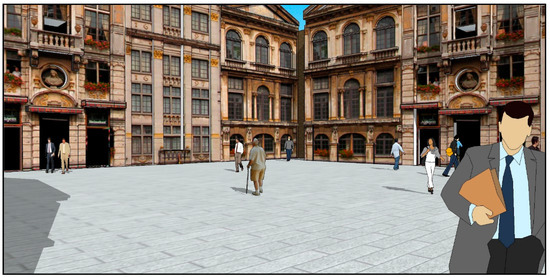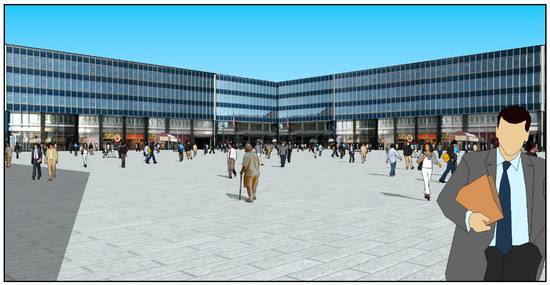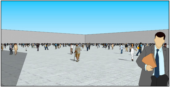 Groups with the same density of individuals (25 people per 25 × 25 m) were added to each simulated square as a reference for the scale of the square (Figure 4, Figure 5 and Figure 6), which was expected to help participants imagine real squares from the simulated images. After all, people are an important visual element composing the landscape of a square. This element was particularly helpful in the images of squares surrounded by empty walls, which would have provided few visual clues regarding scale.
