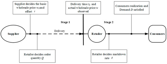 The sequence of events is shown in Figure 1. In the first stage before transportation, the supplier jointly determines the basic wholesale price and the granularity level , whereas the retailer determines the order quantity . Then the supplier proceeds to deliver the food product. In the second stage, the food product arrives at the retailer after time , then the actual wholesale price is observed. Finally, the retailer sets the markdown rate based on the quality of food.