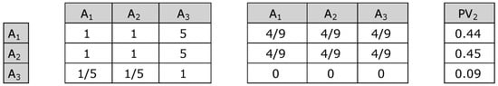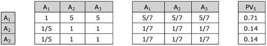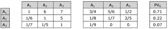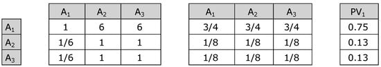 The first step in the hierarchy analysis process is the design of the pairwise comparison matrixes of the three alternatives for each of the selected criteria. This is undertaken for each factor (criteria) which, as previously noted, is in turn defined by n-variables (sub-criteria). In this way, each factor needs n 3 × 3 matrixes.