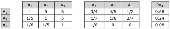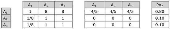 Figure 4, Figure 5, Figure 6, Figure 7, Figure 8, Figure 9 and Figure 10 represent the Alternative Comparison Matrix (ACM), the normalised comparison of alternatives matrix (NCM), and the priority vector (PV) for each of the seven sub-criteria (variables) that define the criterion (factor).
