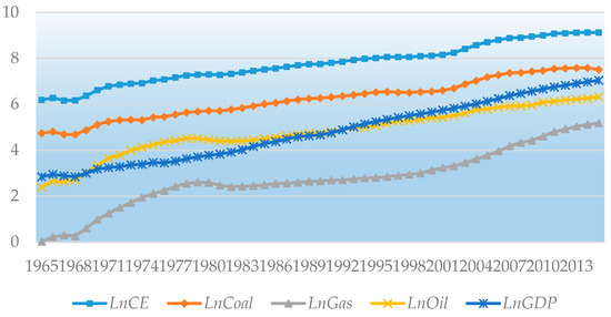 The line chart of the five variables. LnCE, LnCoal, LnGas, LnOil and LnGDP are the natural logarithms of CO2 emissions (CE), coal consumption (Coal), gas consumption (Gas), oil consumption (Oil) and gross domestic product (GDP), respectively.