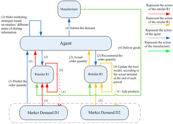 Note that is the gap between the real demand (at time t) and the retailer’s predicted demand. Similarly, is the gap between the real demand (at time t) and the agent’s predicted demand. will be obviously more than [−1,1], so can ensure [−1,1]. , which reflects the influence on the trust value in each phase that the absolute value of what is obtained minus the predictive value of the agent from the actual demand, and the absolute value of what is obtained minus the predictive value of the retailer and the actual demand; the bigger the difference value between the absolute value of what is obtained minus the predictive value of the agent from the actual demand and the absolute value of what is obtained minus the predictive value of the retailer and the actual demand, the smaller the degree of the retailer’s trust towards the agent, and vice versa. For example, when , , and , , this shows that if the retailer predicts more accurately, the retailer would not trust the agent. Therefore, the ratio would be negative and the trust value would decrease. When , , and , , this shows that if the agent predicts more accurately, the retailer would trust the agent, so that the ratio would be positive and the trust value would increase.