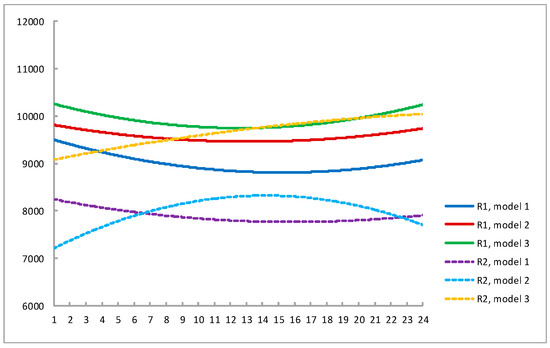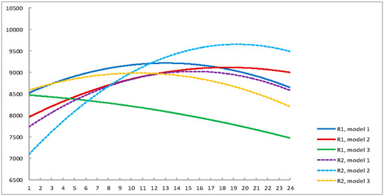 In Figure 3, the horizontal coordinate represents the transaction period, and the vertical coordinate represents the retailer’s profit. We can find that when neither retailer shares information with the agent, the two retailers’ profit trends in profit are almost the same. However, the two retailers’ total profits will be different, for the market circumstances that they face are different and their actual demand is not distributed within the same range.