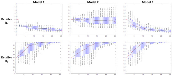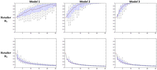 In Figure 4, we set the ratio of the agent’s predictive accuracy to that of the retailer . Similar to Figure 2, in each subgraph, the horizontal coordinate represents the transaction period, and the vertical coordinate represents the trust value. From Figure 4, we find that all of the curves of the trust value are downward. However, when only R1 shares information, the agent, thus knowing this retailer’s predictive function, which may be inexact, will first consider distributing to him/her the ROQ of minimal risk of loss. Additionally, on this basis, the agent considers satisfying the non-sharing retailer. Therefore, the trust value of the sharing retailer declines very slowly. Since the forecast of the non-sharing retailer is becoming more and more devious from the agent’s ROQ, the trust value of the non-sharing retailer falls more rapidly. As a whole, when both retailers share predictive information, the agent, thus knowing the two retailers’ predictive function, will consider making the risk of loss minimal, which is equivalent to that the two retailers partaking of the risk of the agent’s inaccurate prediction. Consequently, the trust values of the two retailers fall almost at the same speed.