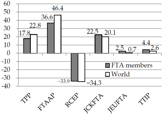 Several previous studies have quantitatively analyzed the economic impact of the TPP (Table 1). Burfisher et al. [6] assessed the impact of the TPP on agriculture using the static GTAP model and GTAP 8 database, and the model was solved with macroprojections and trade policy updates to 2025. They showed that the impact on real GDP is quite small, and that total agricultural exports and imports will increase for all TPP members. Farm sector outputs decrease in Japan and increase in Australia, New Zealand, and the US. Cheong [7] used the recursive dynamic GTAP model and GTAP 8 database. The results showed that country-level changes in 2027 GDP compared with the baseline range from −0.13% (Chile) to 0.97% (New Zealand). Kawasaki [8] used the static GTAP Computable General Equilibrium (CGE) model with capital accumulation and endogenous productivity growth and the GTAP 8 database updated to 2010. They showed that changes in welfare associated with tariff removal as a percentage of real GDP range from 0.1% (US) to 9.9% (Vietnam). Itakura and Lee [9] used the recursive dynamic GTAP model and GTAP 7 database. They showed that changes in 2030 welfare compared with the baseline range from 0.8% (US) to 5.6% (Vietnam). Lee and Itakura [10] used the recursive dynamic GTAP model and GTAP 8.1 database. They showed that changes in 2030 welfare compared with the baseline range from 0.15% (US) to 2.66% (Vietnam), and that Japan’s livestock-sector output decreases by 6.1%. Petri et al. [11] used the recursive dynamic CGE model with Melitz firm heterogeneity, foreign direct investment flows, and preliminary GTAP 8 database. They showed that changes in 2025 GDP compared with the baseline range from 0.4% (US) to 13.6% (Vietnam) and that changes in 2025 exports range from 2.5% (Chile) to 37.3% (Vietnam). Areerat et al. [12] used the static GTAP model and GTAP 7 database. They showed that changes in GDP range from −0.03% (Peru) to 0.49% (Vietnam).