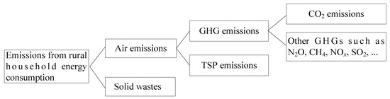 As a whole, the emissions from rural household energy consumption include air emissions and solid wastes. Solid wastes, which mainly derive from the combustion of coal and honeycomb briquettes, are often dumped due to the lack of proper garbage disposal sites, negatively impacting the environment. Air emissions consist of GHG and total suspended particulates (TSP), which are smaller than 100 μm in diameter. Additionally, inhalable particles can cause serious indoor air pollution and do harm to the health of residents such as housewives, elderly people, and children who stay indoors for long periods of time [20]. Other than CO2, methane (CH4), nitrogen oxide (NOx), nitrous oxide (N2O), and sulfur dioxide (SO2) are also influential GHGs (Figure 1). In China, energy-related CH4 emissions are estimated to have risen from 6586.9 Gg in 1980 to 21,943.1 Gg in 2007, with an average annual increase of 4.7% [21]; CO2, SO2, and NOx emissions from household energy consumption indicate that there are two peaks, occurring in winter and summer, due to energy demands for heating and cooling, respectively [22]. Energy consumption is dominated by fossil energy, especially heating by coal-fired stoves, which causes heavy air pollution in winter [23]. In fact, the emissions characteristics also depend on the type of stove used, and the emission ratios of CO-to-CO2 and NOx-to-CO2 are higher for cookstoves than for kangs, implying that kangs have higher combustion efficiency [24]. A kang is a traditional rural Chinese bed made of earth bricks and can be heated by biomass fuels, coal, and electric stoves [25].