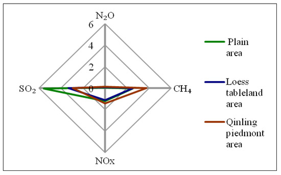 As indicated in Figure 2, the per capita emission of other GHGs increases from the loess tableland (7.00 kg) to the Qinling piedmont (8.20 kg) and plain (9.32 kg) areas. For all types of emissions, CH4 and SO2 are markedly higher than those of N2O and NOx because of their larger emission coefficients. For instance, the SO2 emission coefficient of coal reaches 26.331 g/kgce, whereas that of N2O is only 0.044 g/kgce. Farmers in the plain area have the highest SO2 emission because coal is the most frequent form of energy. The Qinling piedmont area has the highest CH4 emission because biomass energy such as firewood and straw is the most common. There is little difference between CH4 and SO2 emissions in the loess tableland area because of its moderate levels of coal and biomass energy consumption. N2O and NOx emissions are generally highest in the Qinling piedmont area, followed by the plain and loess tableland areas.