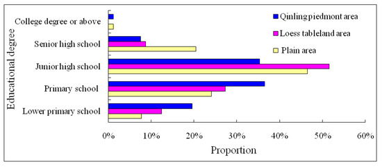 - Educational background. The correlation (0.7526) between educational background and emissions from energy consumption is the second highest. Figure 4 shows that the largest proportion of the population in the loess tableland and plain area is composed of people with a junior high school education, whereas, in the Qinling piedmont area, most have only a primary school level of education. For educational degrees above junior high school level, the proportion is smallest in the Qinling piedmont area (43.98%) and highest in the plain area (68.16%), with the loess tableland area being intermediate (60.25%). Studies have shown that people with little education use more biomass energy than those who are more highly educated [50,51,52]. Using a large amount of biomass energy with larger emission coefficients and lower thermal efficiency generates more emissions. Hence, with the least education, the Qinling piedmont area has the highest emissions from energy consumption.