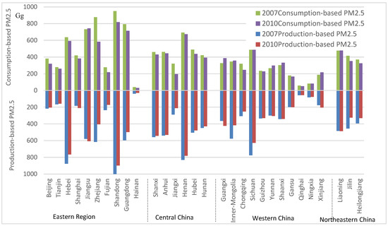 The production-based PM2.5 and consumption-based PM2.5 in 2007 and 2010.