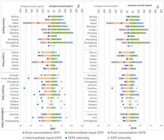 For the embodied PM2.5 emission intensity, we calculated the emissions intensity for both the EEPE and EEPI, and the results are shown in Figure 2. The largest EEPE province is Guizhou (2.62 (2007), 1.70 (2010)), and the largest EEPI provinces are Jilin (1.49 (2007)) and Ningxia (0.75 (2010)). This result is quite different from that for the EEPE (EEPI). When the economic factor is taken into account, the production in western and northeastern provinces accounts for more PM2.5 emissions embodied in provincial trade.