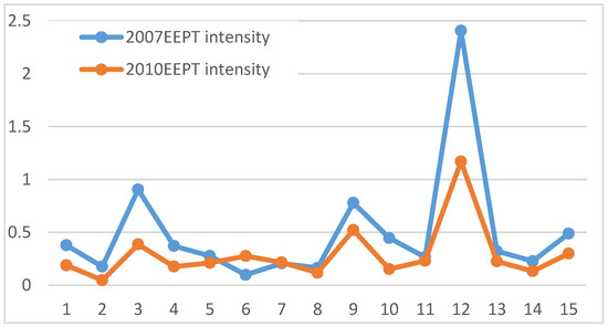 The sectoral EEPT intensity is shown in Figure 3. Clearly, the Construction industry has the largest EEPT intensity in 2007 and 2010. The EEPT intensities of the Coal Mining and Processing industry and the Machinery and Equipment industry are second highest. The sectoral EEPT intensity in 2010 decreased compared with that in 2007.