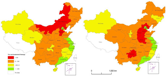 At the provincial level, we focus on the net environmental damage induced by the PM2.5 emissions embodied in provincial trade, which means that each province benefited from its PM2.5 emissions embodied in provincial imports and suffered from its emissions embodied in provincial exports. The results are shown in Figure 4.