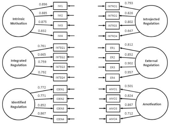 MTES Construct Validity. The six-factor model as presented by Pelletier et al. [23] showed excellent fit indices, with RMSEA = 0.05 (p = 0.000, 0.05 < RMSEA < 0.04), CFI = 0.95, TLI = 0.94). No modifications of indices were observed, which would suggest problematic covariances between items belonging to different subscales. Moreover, all items loaded significantly onto their subscale, and the pattern of factor loadings within each subscale were harmonious, with all items showing loadings of similar importance of the reference item fixed at 1.000. Figure 1 shows the six-factor model of the MTES; the model includes error variances for all 24 items, factor variances for all six factors, and correlations between all factors.