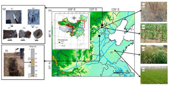 Location of the samples in this study. (a) Collection location of the surface soil and sedimentary samples. A1: the wheat field in Shandong Province; A2: the maize field in Beijing; A3: the Nanzhuangtou site; A4: the Zhuannian site; (b) the wheat field in Shandong Province; (c) the natural secondary vegetation near the wheat field in Shandong Province; (d) the maize field in Beijing; (e) the natural secondary vegetation near the maize field in Beijing; (f) the profile for samples in the Nanzhuangtou site. F1: surface soil; F2, F4, F6: transition layer; F3: overlying layer, F5: cultural sediments; F7: underlayer; and (g) soil samples from the Zhuannian site. G1: overlying layer; G2: underlayer; G3: cultural sediments from pit fillings; G4, G5: cultural sediments.