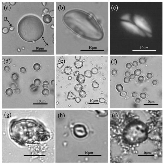 Starch grains from modern plant seeds, surface soils and sediments. (a–c) Starch grains from wheat seeds; (d) starch grains from green bristlegrass seeds from Shandong Province; (e) starch grains from maize seeds; (f) starch grains from green bristlegrass seeds from Beijing; (g) starch grain from the cultural layer of the Nanzhuangtou site; and (h,i) Starch grains from the cultural layer of the Zhuannian site.