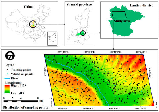 It is essential that sampling occurs during the driest months, after crops have been harvested, to reduce the interference of soil moisture, soil texture, cloud cover, and vegetation for the multi-spectral information of the remote sensor. The base map of field sampling was overlaid pattern spots by the present land-use map and soil type map (from the Lantian County Agricultural Technology Popularization Center, China). Based on the sampling requirements of the “Rules for soil quality survey and assessment, NY/T 1634-2008” [37], which was released by the Ministry of Agriculture of the People’s Republic of China, they set one point per 66.66 ha and the topsoil depth is from 0 cm to 20 cm. We combined this with the actual situation of the study area, used a uniform random sampling technique, and set one point per 60 ha. However, the sampling points should avoid the interference of the land type such as buildings, ditches, scrap heaps, dunghills, cemeteries, and so on, whilst the distance from a railway or main street should exceed 350 m. A total of 472 topsoil (0–20 cm) samples (Figure 1) were collected over the study area in November 2012, taking the coordinates, soil type, and topography into consideration. All soil mixed samples included four corners of a square within a 10 m length, each of approximately 2 kg, and these were mixed thoroughly. This was developed in accordance with the technical requirements of the “Chinese agriculture Industry standard, NY/T 1211.1-2006” [38] for measured soil organic matter, which was released by the Ministry of Agriculture of the People’s Republic of China. All samples were naturally air dried at room temperature and passed through a 2-mm nylon sieve after removing plant residues and stones. In the analytic procedure, samples were oxidized by 0.4 mol L−1 potassium dichromate-sulfuric acid, then heated to about 170–180 °C for 5 min ± 0.5 min, and any excess potassium dichromate was determined by titration with standard 0.1 mol L−1 ferrous sulfate (FeSO4). Meanwhile, two blank experiments were completed when analyzing each batch of samples. The SOM content was calculated by the conventional carbon factor (1.724), as follows [39,40]: