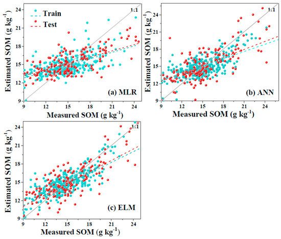 Observed versus estimated SOM content, using (a) MLR, (b) ANN, and (c) ELM models.