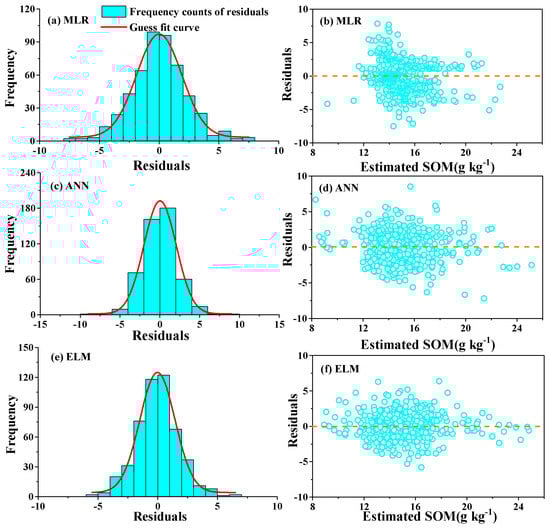 MLR, ANN, and ELM diagnostics of the residuals: histogram ((a) MLR model, (c) ANN model, and (e) ELM model) and residuals versus estimated SOM value ((b) MLR model, (d) ANN model, and (f) EKM model).