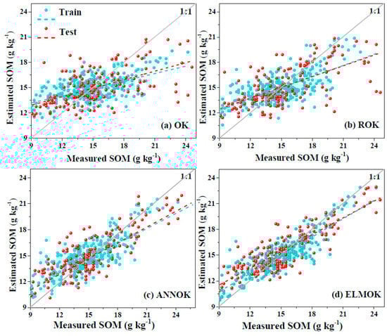 Observed versus estimated SOM content, using (a) OK, (b) ROK, (c) ANNOK, and (d) ELMOK models.