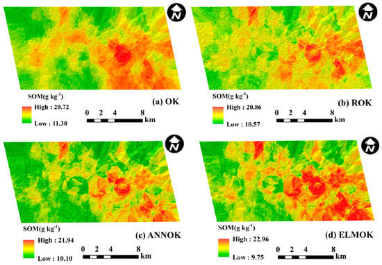 Predicted SOM content (g kg−1) maps by (a) OK, (b) ROK, (c) ANNOK, and (d) ELMOK, all the maps are in 30 m resolution.