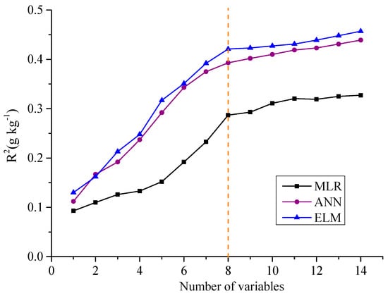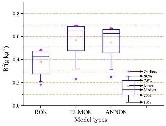 In order to further determine the driving forces of multi-source auxiliary variables, we observed the effects of different factors for the spatial variability of soil organic matter by adding or deleting collaborative variables, which was based on the idea of the stepwise regression in MLR, ANN, and ELM prediction models. By adding or removing the amounts of variables (the type of each variable to be added or deleted should be the same in the three models), we obtained the variation trend of the coefficient of determination (R2) of the three models from one to 14 variables, and then drew the distribution box diagram according to the coefficient of each model. As can be seen in Figure 6 and Figure 7, according to the R2 of each model with a different number of variables, the interpretative ability of three models for SOM content from better to worse were: ELM > ANN > MLR. When the number of variables was less than eight, the R2 showed obvious attenuation. However, when the number of variables gradually increased from 8 to 14, the R2 of the three models did not significantly improve. In addition, the mean value of R2 between the auxiliary variables and soil organic matter in the three models in descending order were: ELMOK > ANNOK > ROK.
