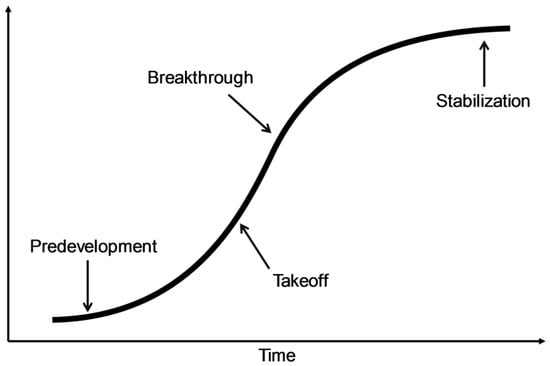 Transitions are characterized as being gradual or incremental, often spanning generations, and non-linear, occurring as multiple variables change simultaneously. The S-curve (Figure 1) is used to describe phases of a transition in the sustainability transitions literature [1], similar to the S-curve in technological adoption and diffusion of innovation theory [12] and related research. The four main phases are: predevelopment (the status quo holds, but contestations begin to appear), takeoff (system changes begin, due to social or technological innovation), breakthrough (also “acceleration”; changes become more prominent as the innovations in social, economic, ecological and other areas begin to accumulate), and stabilization (changes decrease, and a new dynamic equilibrium is established).