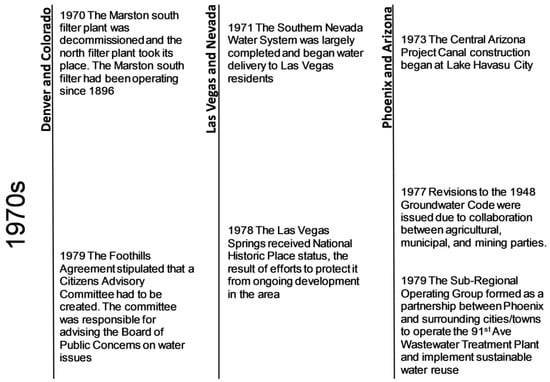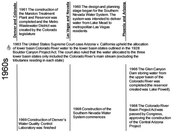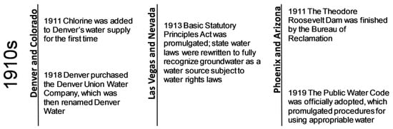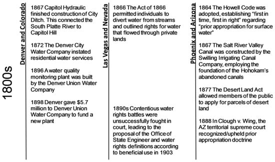 As European settlers continued to expand westward in the United States, the territories of Arizona, Colorado, and Nevada attracted people hoping to strike gold or secure larger land parcels. During the latter half of this century, Arizona, Colorado, and Nevada adopted legislation that influenced water governance for decades to come (Figure 2) [43]. The governments of the regions that would become the cities of Denver, Las Vegas, and Phoenix were moving towards “sewered cities.” Efforts were focused on implementing sewage systems and investing in water treatment and monitoring facilities.