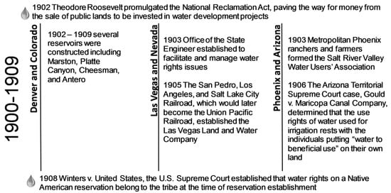 As the United States’ population continued to increase, the federal government realized that water infrastructure expansions and upgrades were becoming progressively vital. The promulgation of the National Reclamation Act by Theodore Roosevelt in 1902 was a breakthrough event in water governance in the western United States (Figure 3) and provided the means to fund major water infrastructure improvements and additions throughout the country [46]. The Act was key to continued western United States’ industrial and residential development and established that “…beneficial use shall be the basis, the measure, and the limit of the right” ([47], p. 76). The act recognized that the arid southwestern United States needed irrigation networks to provide water to its growing population. The U.S. Reclamation Service (now known as the Bureau of Reclamation) was created to manage the resulting funds from the sale of public lands that the Act determined could be used for water infrastructure and development projects. The Act’s promulgation represented the accumulation of years of prior concerns with the existing state of funds available to expand water development in the western United States. Without the National Reclamation Act, it would have been extremely difficult to fund major water infrastructure projects, such as the Hoover Dam, that support present populations in Denver, Las Vegas, and Phoenix.