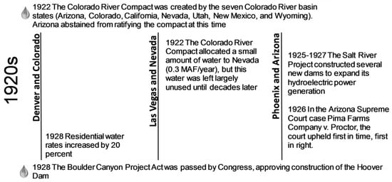 Denver’s concern with public health issues related to water embodied characteristics of the “sewered city,” prior to the city adopting all of the characteristics of a “water supply” city (Figure 4). Infrastructure including dams and pipes would continue to be completed as the city simultaneously focused on reducing issues like water-borne illnesses (such as cholera). Nevada’s state legislature revised state water law in 1913, and the basic statutory principles have endured to the present. The principles recognized groundwater and made early references to conserving Nevada’s groundwater [45]. This decade also saw the formation of the League of the Southwest, whose membership was comprised of the seven states that would later sign the Colorado River Compact. These social changes, including the formation of the League, were part of takeoff events, precursors to the coming breakthrough of the Colorado River Compact. The League was formed to promote economic development throughout the southwest, which eventually included lobbying for the creation of an agreement among the states regarding Colorado River water allocation [44].