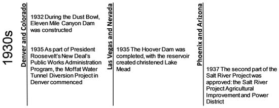 The 1930s brought the worst drought in U.S. history, the Dust Bowl. Despite the severe drought conditions that plagued much of the Midwestern and western U.S., water expansion projects continued in some states, as larger cities sought to improve drainage and storage designs to become “drained cities” responsible for providing safe, limitless water to their constituents (Figure 6). In Denver, Eleven Mile Canyon Dam was constructed in 1932. In 1935, as part of President Roosevelt’s New Deal’s Public Works Administration Program, the Moffat Water Tunnel Diversion Project in Denver commenced, and water delivery occurred one year later [49]. Amid apprehension surrounding diminishing groundwater supplies in Arizona, a group was appointed to study groundwater supplies and characteristics in 1938. This group catalyzed the appropriation of funds to the U.S. Geological Survey for the purposes of monitoring Arizona groundwater [56]. In 1935, the Hoover Dam was completed on the border of Arizona and Nevada, with the reservoir created named Lake Mead. Lake Mead would later provide most of Las Vegas’s residential water supply.