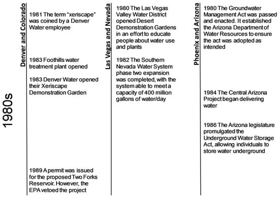 In Colorado, water conservation messages also became more prominent during the 1980s, beginning to challenge the status quo of limitless water supply (Figure 11). In 1981, a Denver Water employee coined the term “xeriscape,” which is now commonly known in the western U.S. and elsewhere as a minimal water use landscape design [63]. Near Denver, the large Foothills water treatment plant was opened by Denver Water in 1983 after years of obstacles [49]. Amid the continued expansion of the Southern Nevada Water System, concerns for the environment also emerged. The 1988 Supreme Court case Nevada v. Morros upheld the Nevada State Engineer’s decisions related to ecosystem conservation, upholding the Endangered Species Act and assuring water rights to federal agencies for wildlife and recreation [45]. These actions further strengthened the stance of Denver, Las Vegas, and Phoenix as emerging “waterways cities” concerned with the environment.